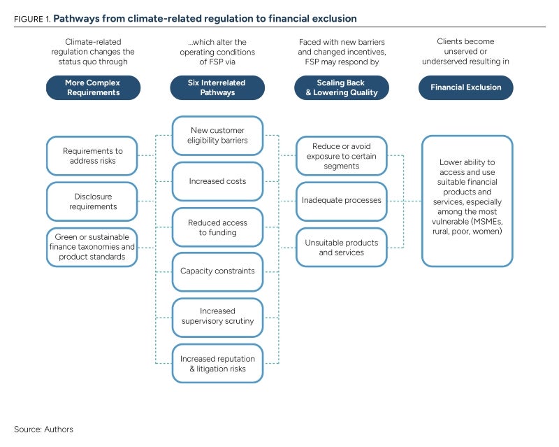 - Climate-related regulation may affect the ability and incentives of financial service providers to extend credit to vulnerable segments through six interrelated and mutually reinforcing pathways: new customer eligibility barriers; increased costs; reduced access to funds; capacity constraints; heightened supervisory scrutiny and elevated reputational and litigation risks.