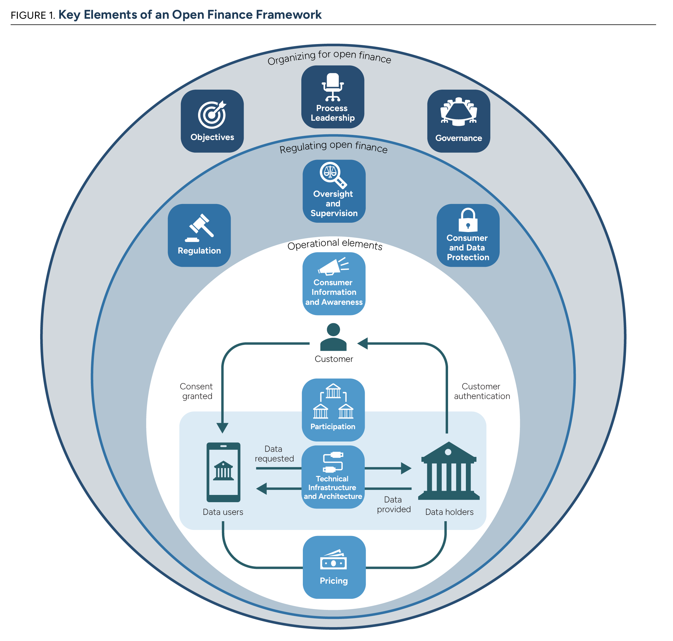 - Objectives – Define the desirable policy objectives and how open finance will contribute to them. Before starting design and implementation of an open finance framework, it is important to identify which market barriers open finance aims to address , define which policy objectives open finance seeks, outline how open finance will help achieve these, and assess whether the key enabling elements are in place.