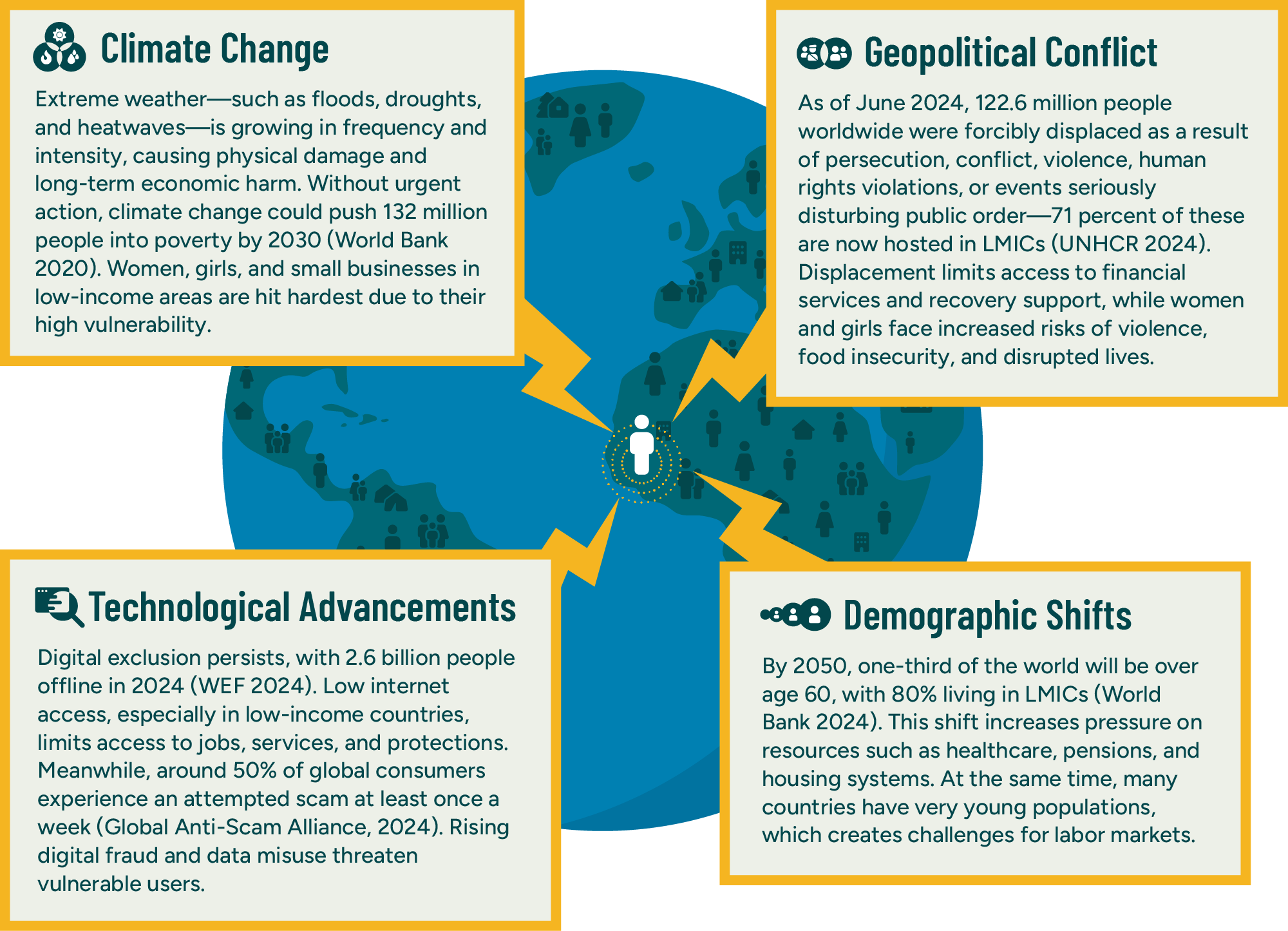 Across the globe, extreme events are hitting faster, harder, and more frequently, while the impacts are often compounding. Geopolitical conflict, climate change, trade tensions, demographic shifts, global pandemics and increasing cyber risks are among the many risks now unfolding simultaneously and with growing intensity, amplifying vulnerabilities, especially for low-income populations and small and medium enterprises (MSEs). If left unaddressed, these vulnerabilities can create ripple effects that have national, regional, and global consequences.