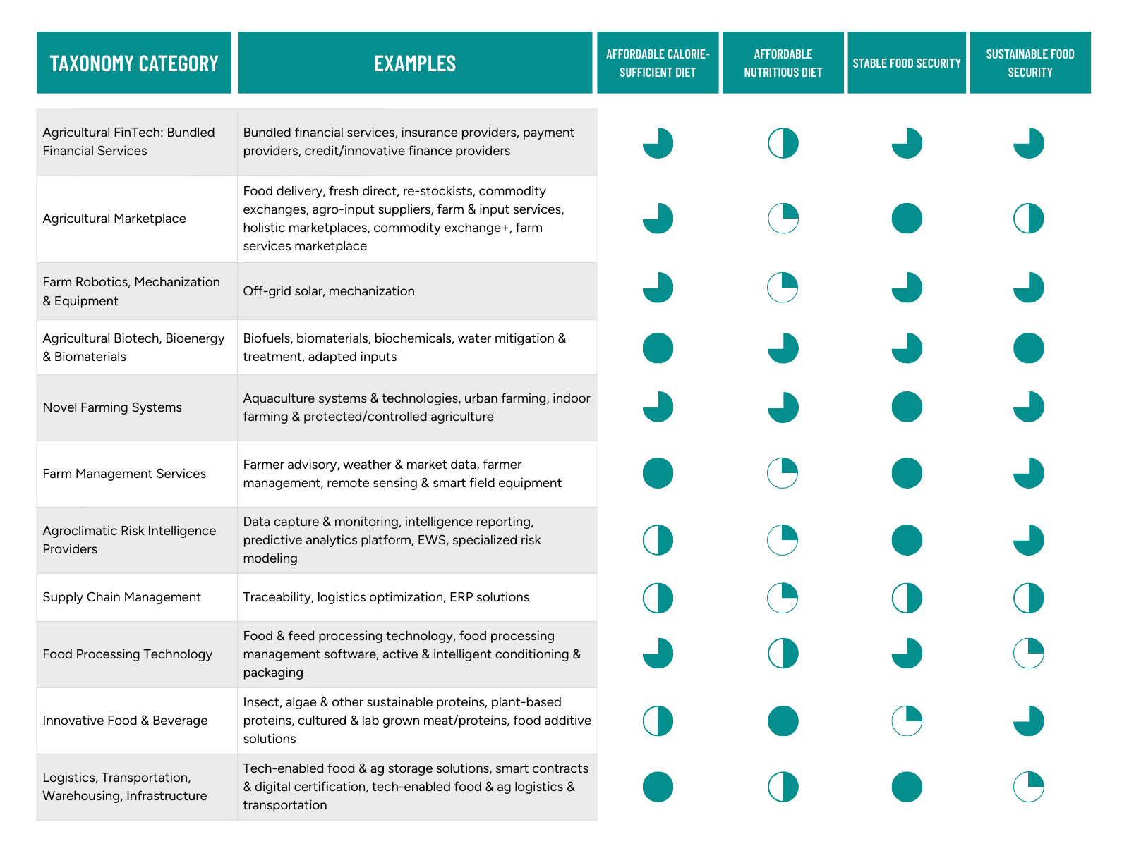Figure 1: AgTech taxonomy category and its relative incidence on each of the dimensions that define food security.